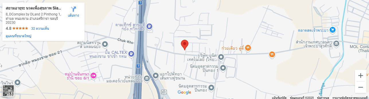 ติดต่อเรา SiamAryurra สยามอายุระ นวดเพื่อสุขภาพ 8/2 หมู่ที่ 10 ดีคอมเพล็กซ์ปิ่นทอง 1ตำบลหนองขาม อำเภอศรีราชาจังหวัดชลบุรี 20230 เปิดทำการ จันทร์ – อาทิตย์ เวลา 09.30-22.20 น. โทรศัพท์ : 064-246-5455 โทรสอบถาม-จองนวด LINE สอบถาม-จองนวด คลิกดูแผนที่